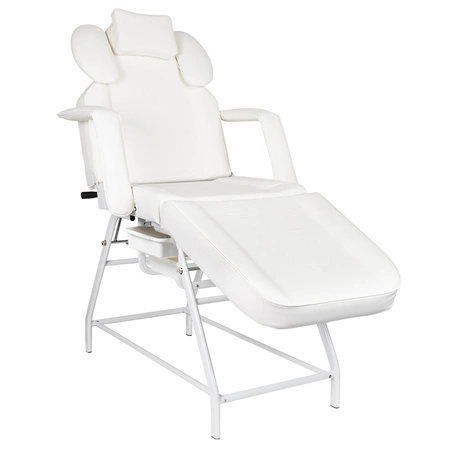 Fotel posiada ręczną regulację podnóżka, oparcia oraz podparcia rąk dla wykonywującego zabieg. Zastosowane podparcie rąk jest niezwykle praktycznym rozwiązaniem nie spotykamym w innych fotelach. Wyposażony w wygodną poduszkę dla klienta oraz podręczne kuwety na umieszczenie niezbędnych akcesoriów.