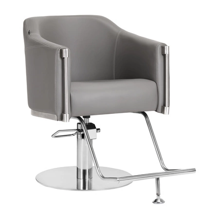 Solidna, okrągła podstawa zapewnia stabilność w trakcie użytkowania. Gładka powierzchnia sprawia, że element ten jest łatwy do utrzymania w czystości. Szerokie siedzisko, wypełnione pianką o odpowiedniej twardości, gwarantuje wysoki komfort użytkowania i wygodę nawet podczas wielogodzinnych zabiegów. Podłokietniki znajdują się na wysokości, która pozwala na prawidłowe ułożenie barków klienta – sprawia to, że nie chowa głowy w ramionach ani się nie garbi – wyraźnie usprawniając zabiegi, w tym strzyżenie. Ułatwia to precyzyjne wykonywanie usług.