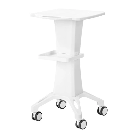 Posiada półkę na urządzenie oraz drugą na akcesoria, a dzięki kółkom stolik jest mobilny i łatwy do przesuwania. Prosta konstrukcja, stelaż z trwałego tworzywa sztucznego w odcieniach bieli sprawia, że stolik jest zarówno estetyczny, jak i łatwy do utrzymania w czystości. Cztery kółka z blokadą pozwalają na swobodne przestawianie, co znacząco ułatwia pracę w salonie, a solidne materiały gwarantują długotrwałą wytrzymałość.