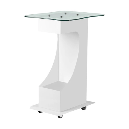 Funkcjonalny, metalowo-szklany stolik z gumowymi kółkami z funkcją blokady. Iidealnie sprawdza się jako stolik pod urządzenie kosmetyczne. Posiada stabilną półkę na urządzenie a dzięki kółką stolik jest mobilny i łatwy do przesuwania. Mebel zapewnia wygodę i komfort podczas pracy