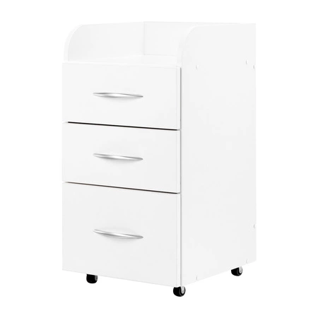 Szafka z 3 szufladami na prowadnicach rolkowych kolorze białym. Szafka ma zainstalowane kółka, co umożliwia łatwe przesuwanie jej po podłodze.