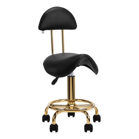 Wygodny, stabilny taboret kosmetyczny z oparciem, z profilowanym siedziskiem, elementy metalowe w kolorze złotym. Na pięcioramiennej podstawie z plastikowymi kółkami. Dostępny w kolorze czarnym, niezbędny mebel w gabinecie kosmetycznym.