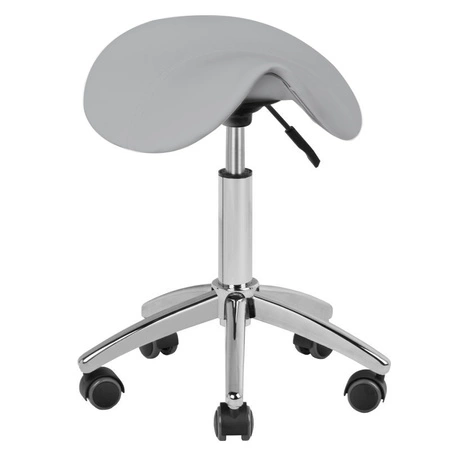 Wygodny, stabilny taboret kosmetyczny bez oparcia, z profilowanym siedziskiem, na pięcioramiennej podstawie z gumowanymi kółkami,